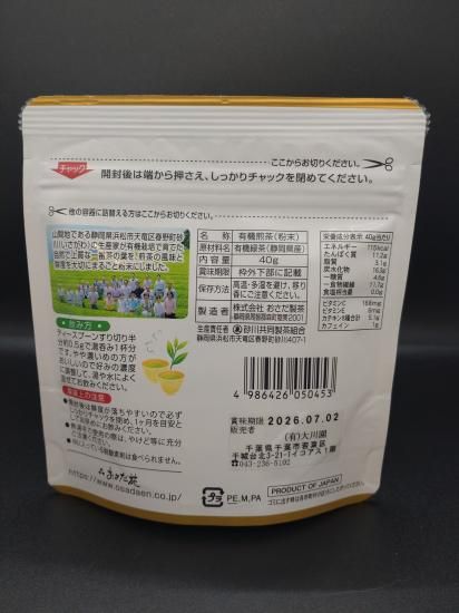 静岡県産100%の抹茶を贅沢に使用した高品質品。石臼で挽いた濃厚な味わいと豊かな香りが特長。朝やリフレッシュタイムに最適。日光を避けて保管。
